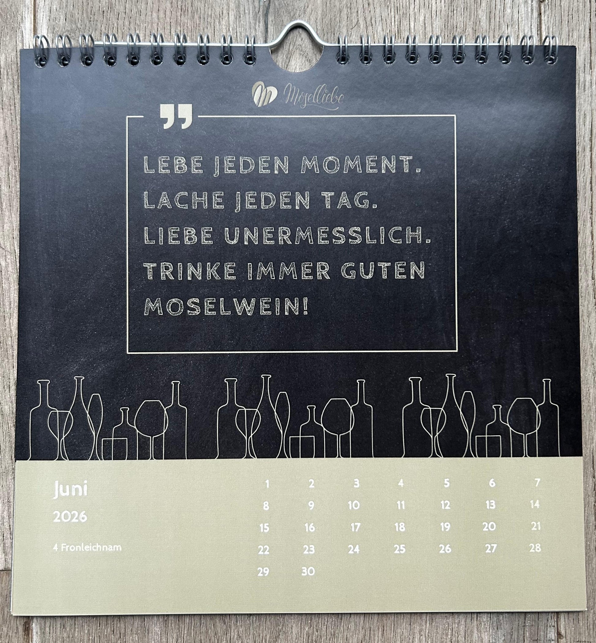 Der Moselliebe-Kalender 2026 ist der perfekte Begleiter für alle, die ihre Liebe zu Moselwein jede Woche neu feiern möchten. In diesem besonderen Kalender findest du humorvolle, inspirierende und charmante Weinsprüche, die dir das ganze Jahr über ein Lächeln schenken – immer mit einem Augenzwinkern und einem Glas Moselwein im Sinn.